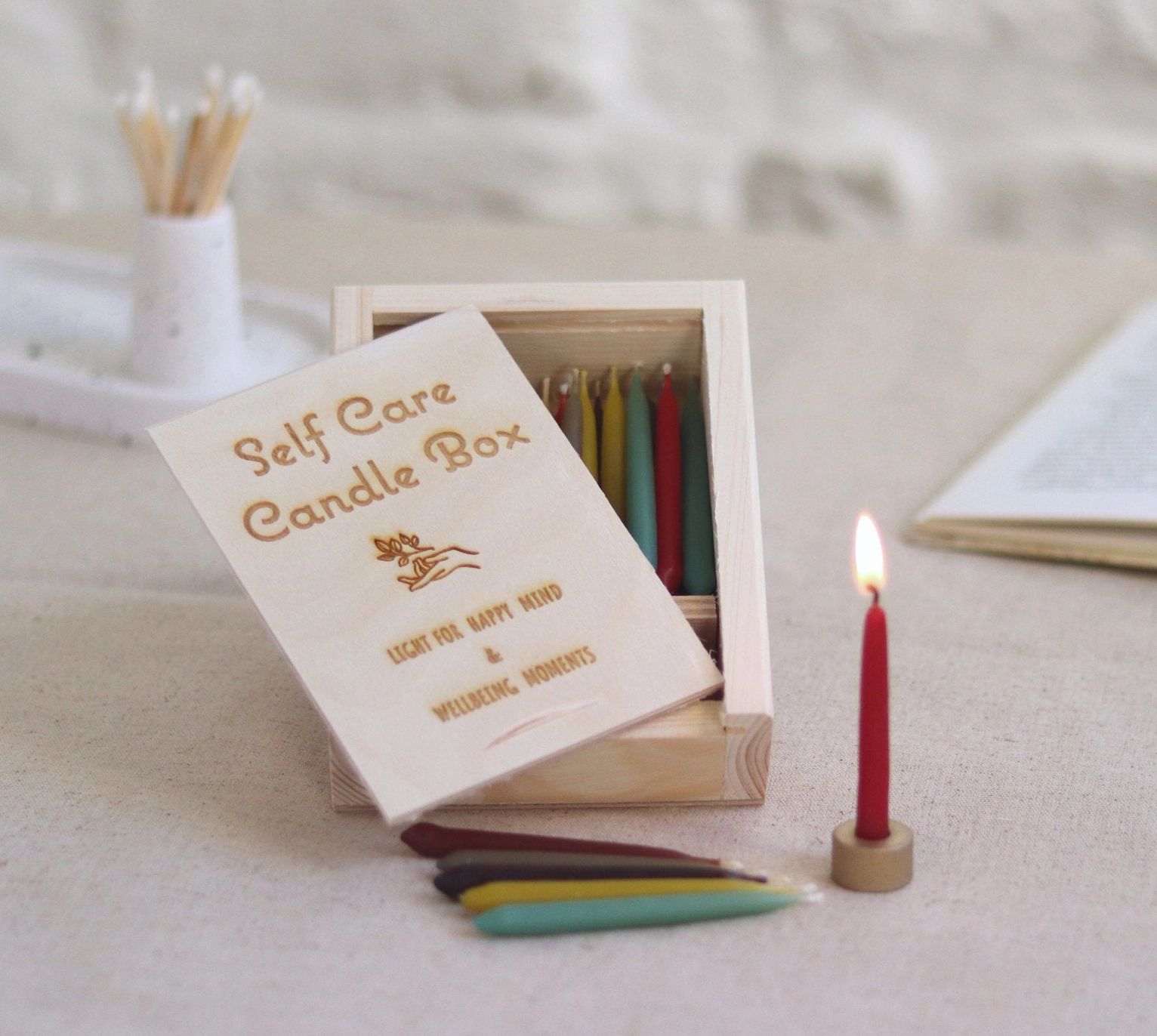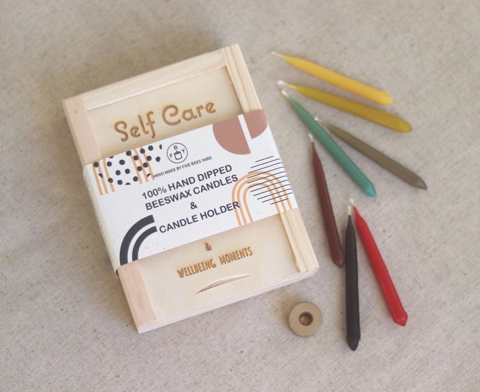 20 hand dipped raw beeswax candles with brass holder presented in a wooden box. These small candles burn for 20-30 mins – ideal for rituals, meditation, yoga, or given as a thoughtful gift. The cute wooden box is perfect for taking with you on journeys too.